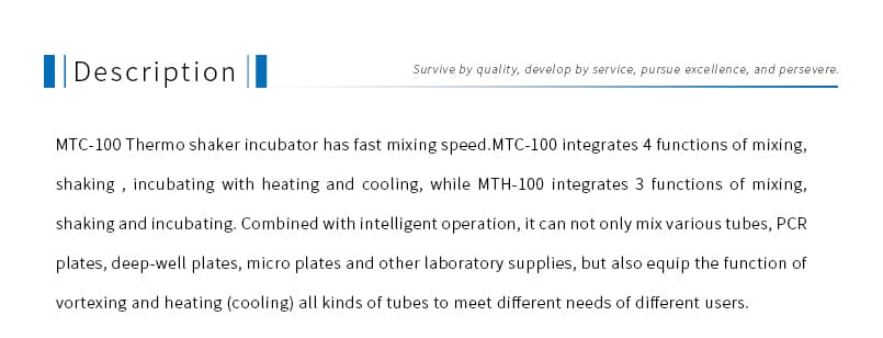 • Product description: MTC-100 Thermo Shaker Incubator has fast mixing speed.